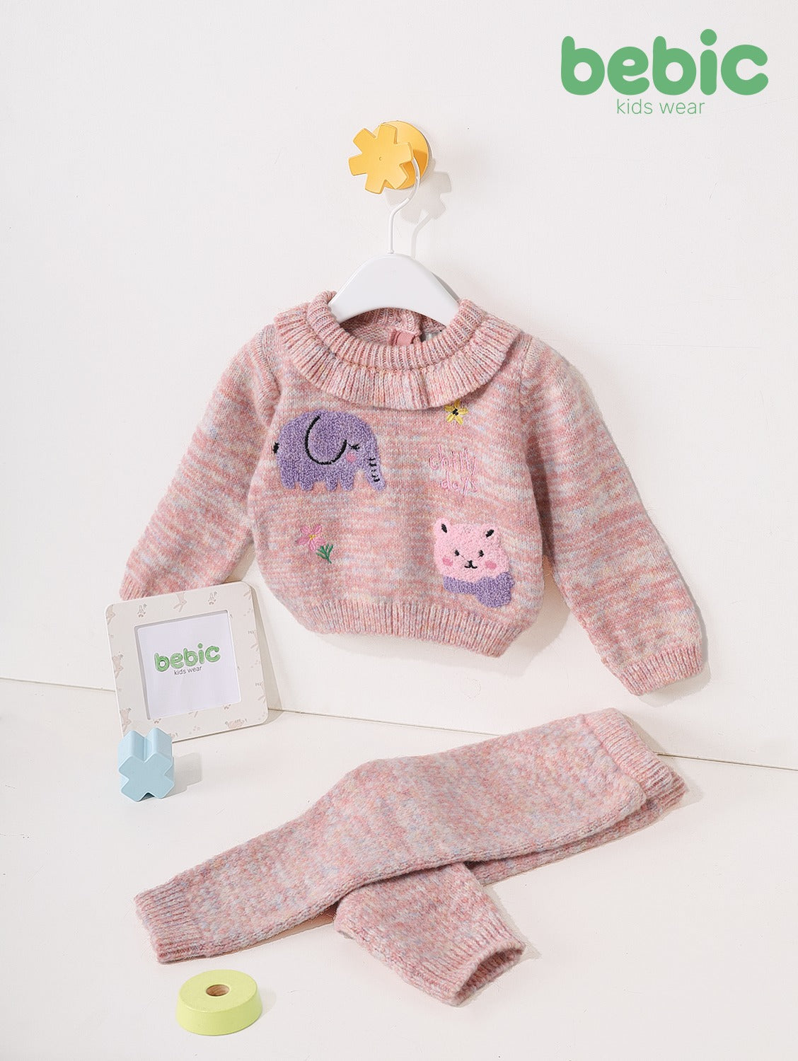 Sweater: Made from soft, combed wool knit, it features a high neck with delicate ruffles. It's adorned with cute animal embroidery, including an elephant and a piglet, in shades of purple and pink. Pants: Made from the same fabric and color as the sweater, creating a coordinated and perfect set for staying warm.