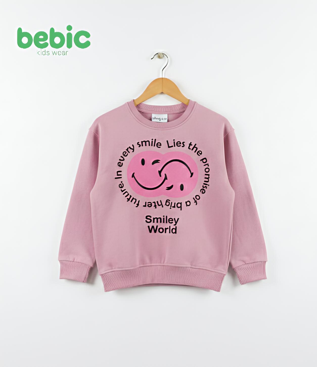 This pink sweatshirt from "bebic" is a wardrobe essential that combines modern style with ultimate comfort for children. The design features a soft and appealing pink hue, with a creative central print of two smiling faces intertwined in vibrant pink, surrounded by the inspiring phrase "In every smile lies the promise of a brighter future" in a stylish circular font, adding a touch of optimism and vibrancy. Made from high-quality cotton with a round neck and elasticated cuffs and hem for warmth and a perfect fit during movement, it's the ideal choice for casual everyday looks that are both stylish and cheerful.