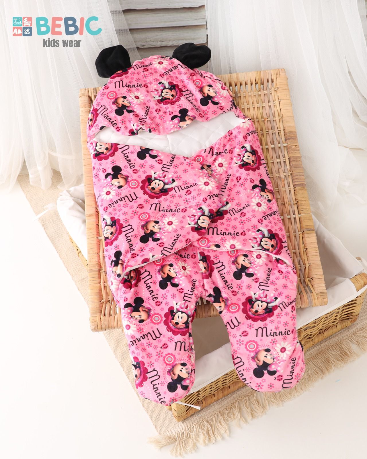 This attractive pink poncho is an excellent alternative to a traditional duvet, providing warmth and comfort for your little one. It features a stylish, repeating print of the beloved Minnie Mouse character and a hood with black ears. The poncho is fully lined for warmth during the winter and is designed for easy carrying and changing. It's a comfortable and essential piece from Baby Kids Wear.
