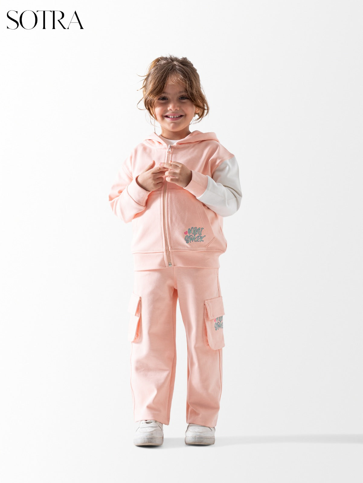 This girls' tracksuit combines a touch of femininity with practical comfort, featuring a soft salmon pink hue that will make your little girl shine. The set includes a hoodie with a full-zip front for easy dressing, and a stylish contrasting sleeve design—one pink and one white—with a chic "Mini Spark" embroidered detail on the side. The matching pants have a relaxed fit and straight legs, and prominent side cargo pockets add a touch of casual flair, making them perfect for school activities or everyday outings. Made from high-quality cotton, this set ensures your child stays warm and soft while maintaining a stylish and trendy look that's right on trend.