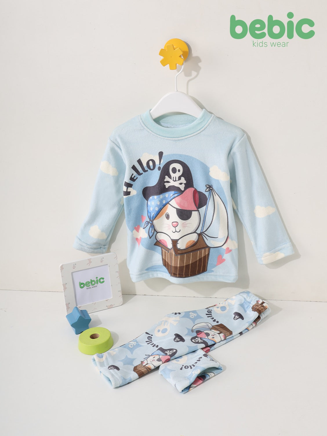 These delightful children's pajamas from Bebic kids wear come in a light sky blue color. The top features a print of a cute cat dressed as a pirate, riding in a barrel as a boat, with white clouds and the words "Hello!".
