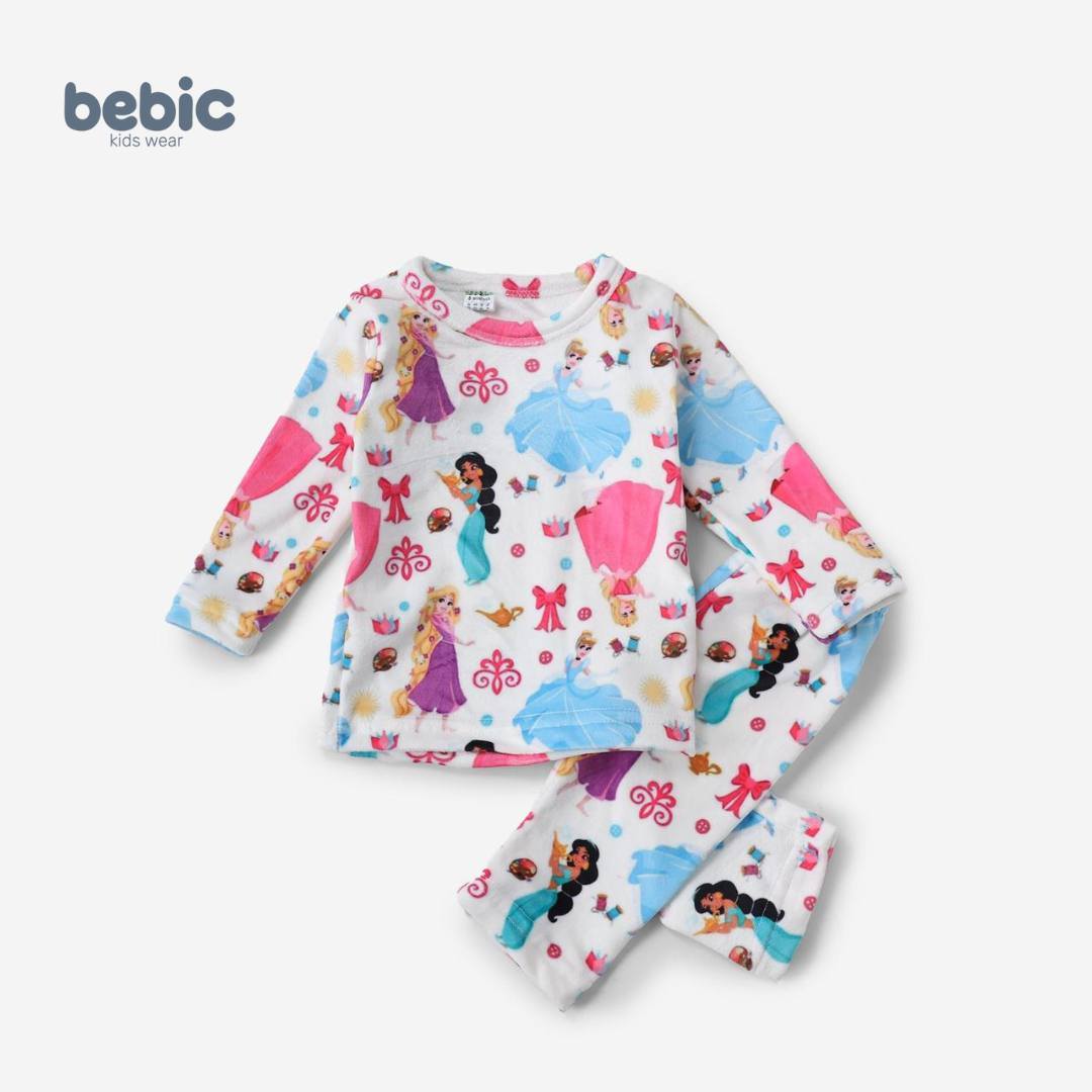 This long-sleeved, pants-only pajama set is perfect for little girls aged 6 months to 3 years. Its basic white color is decorated all over with a colorful print of popular princess characters (such as Rapunzel, Jasmine, and other characters in various dresses), along with bows and magical motifs. The vibrant print in purple, blue, and pink makes it attractive and comfortable for bedtime or playtime.