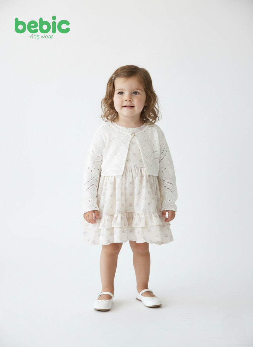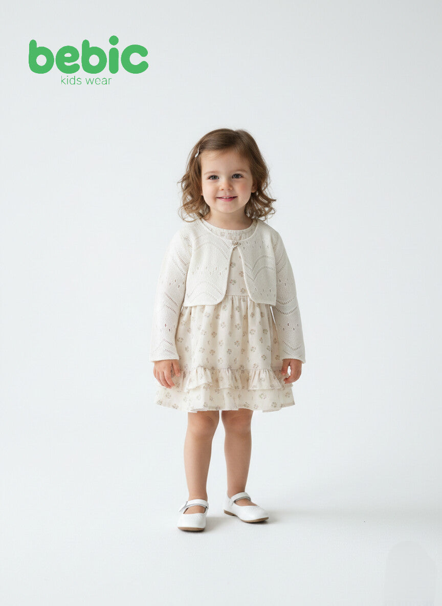 This photo shows a radiant and innocent little girl wearing a stylish outfit from the children's brand "bebic," combining simplicity and sophistication. The dress is made of soft, cream-colored fabric adorned with delicate, small floral prints, and features a multi-layered ruffled skirt that adds a touch of playfulness and charm. A crisp white knitted bolero, featuring intricate lace patterns and geometric details, completes the look. Classic white Mary Jane shoes complete the ensemble, while her naturally wavy brown hair is held in place by a simple hair clip, making her look like a little princess in a professional photoshoot against a pristine white background that highlights the details of the outfit and the child's radiant beauty.