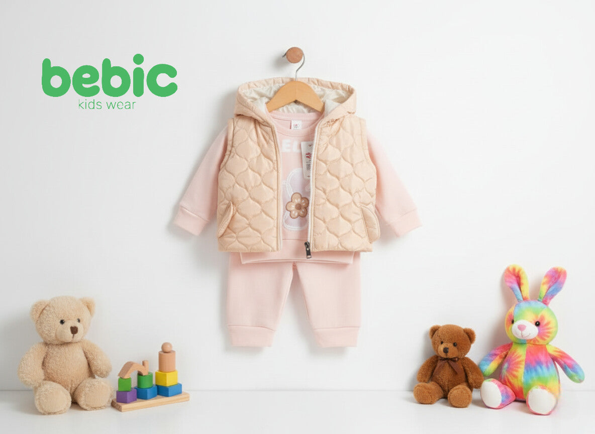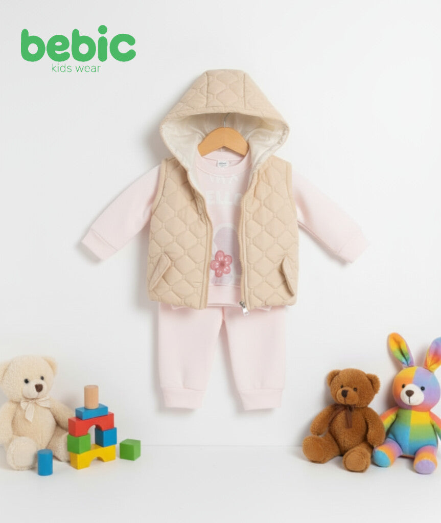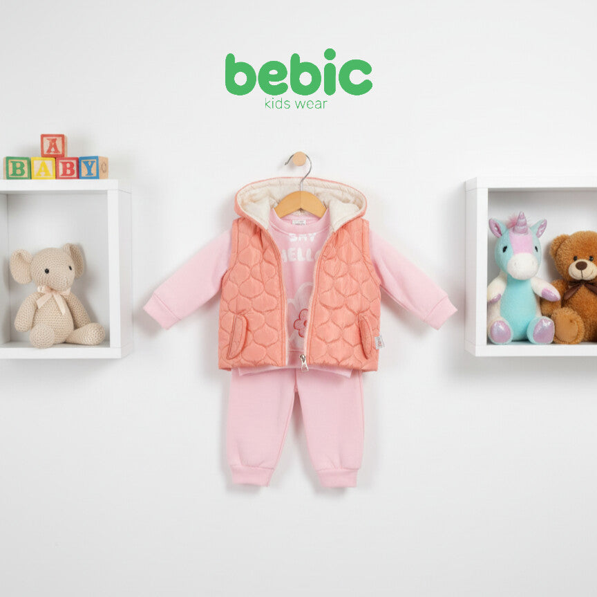 Sweatshirt and trousers (basic set): In light pink (pastel), often made of warm cotton or Melton fabric. The sweatshirt has a simple central print on the front (it looks like a flower or a phrase).