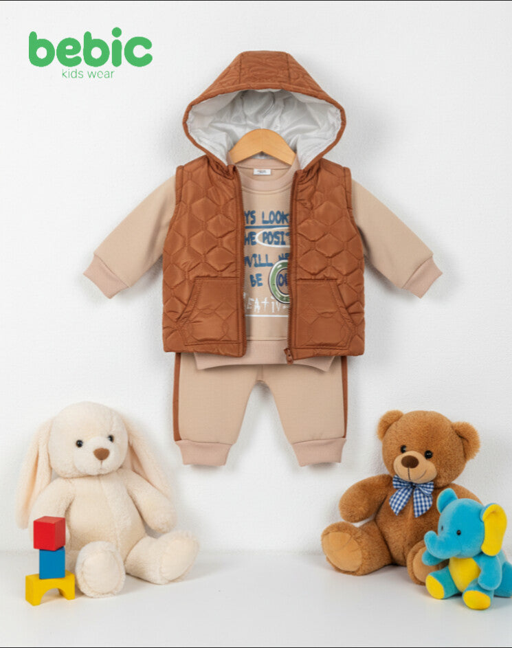 This stylish and warm winter sportswear set for boys from Bebic Kids Wear consists of three pieces. The two basic pieces (sweatshirt and pants) are made of thick fabric. The sweatshirt features a positive print in the center, and the pants have a black side stripe. The third piece is a dark blue (navy) padded vest with pockets and a diamond-shaped quilted design, along with a white lined hood, giving the set a sporty and warm look suitable for cold weather.