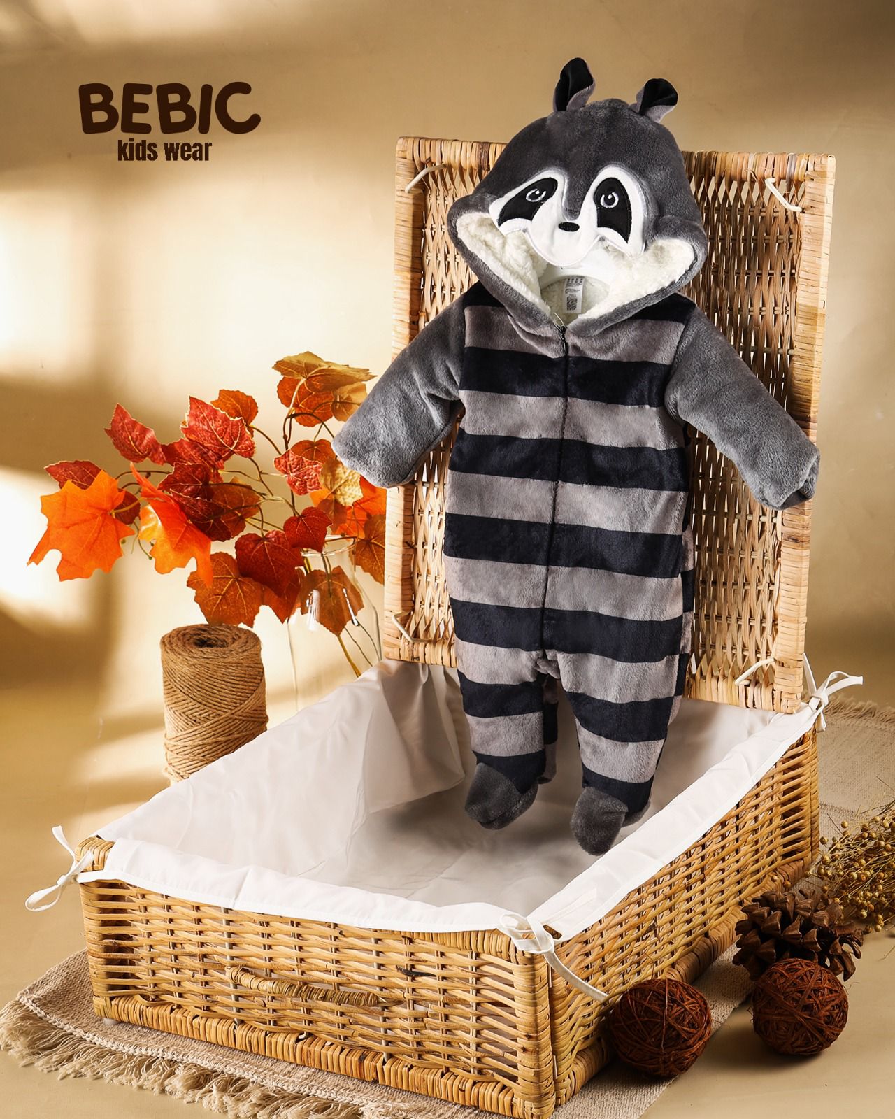 This winter jumpsuit from Bebic features a charming raccoon design that combines warmth and exceptional style for your little one. Made from soft, high-quality plush fabric, it feels gentle against their delicate skin. The design boasts a striking horizontal stripe pattern in shades of gray and black, with a hood lined with warm white faux fur and adorned with a playful raccoon face. The jumpsuit has a full front zipper for easy dressing and built-in feet to ensure complete warmth from head to toe, making it the perfect choice for chilly days and special winter outings, giving your child a stylish yet cozy look.