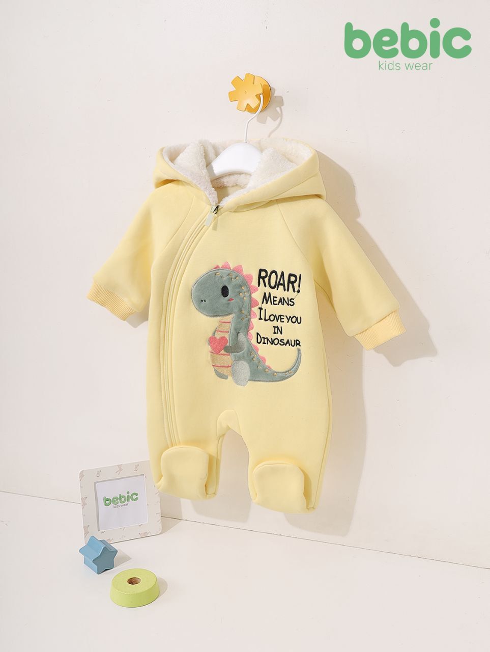 A warm, light buttery yellow winter romper for babies. The romper is lined with soft sherpa/teddy fleece, especially around the hood, to keep the head cozy. It features a slanted front zipper for easy dressing and undressing. A cute dinosaur holding a heart is featured in the center, along with the playful phrase: "ROAR! MEANS I LOVE YOU IN DINOSAUR." The feet are enclosed and the cuffs are snug for extra warmth.