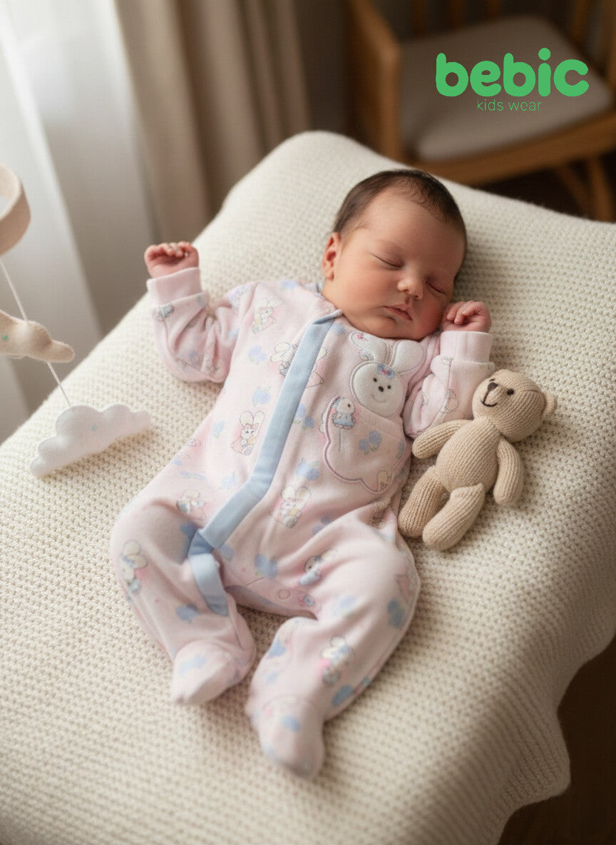 This set comes in a soft pastel pink, making it the perfect choice for little princesses. The romper is adorned with an all-over print of adorable cartoon bunnies surrounded by tiny flowers, creating an atmosphere of innocence and sweetness. The design features a clever contrast: the light blue zipper breaks up the pink in a modern way. The front pocket is embellished with a large white bunny with a smiling face and a blue bow, making it a special addition to your baby's wardrobe. Designed with closed feet for warmth, the set is made from super-soft cotton fabric that's gentle on delicate baby skin.