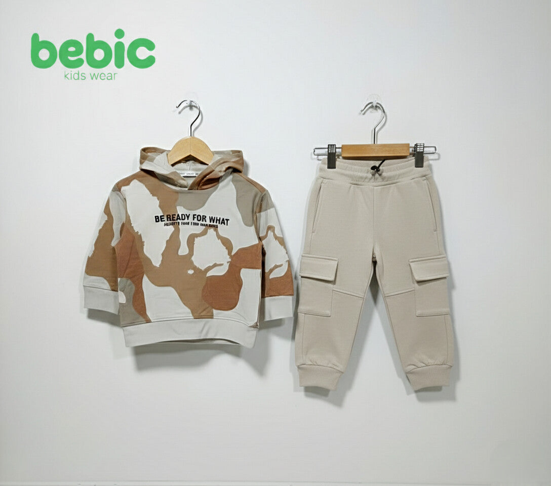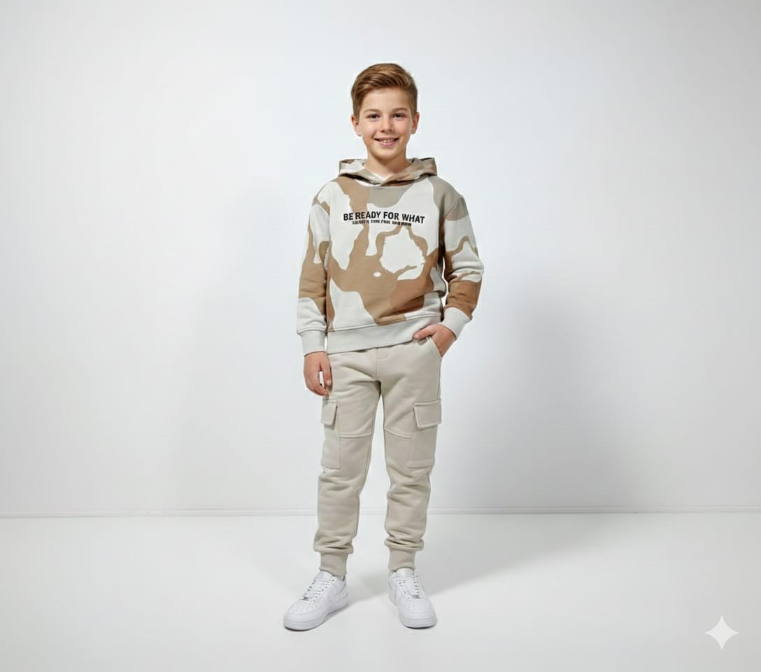 These boys' jogger pants are an essential piece that combines ultimate comfort with a modern look. Made from a soft, stretchy fabric in a calming beige color that's easy to coordinate with a variety of other colors, the design features a comfortable elastic waistband and tapered cuffs for a tailored, sporty fit. The practical side cargo pockets with flaps add a touch of adventure and ruggedness. Double horizontal stitching above the knee enhances the pants' durability and gives them an attractive, geometric shape, making them the perfect choice for everyday activities and playtime. Their unique blend of practical style and freedom of movement is essential for every child.