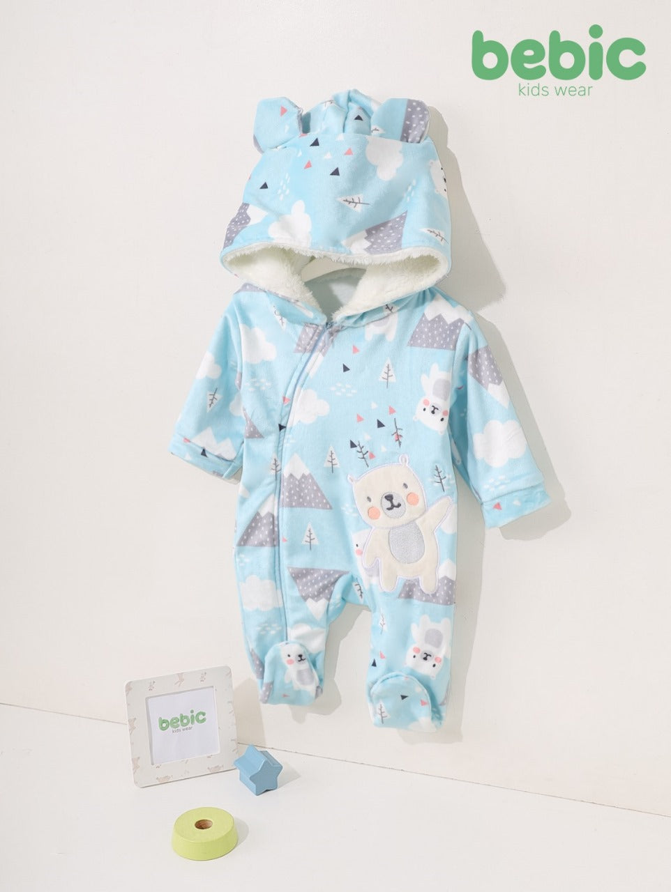 This light blue (sky blue) baby winter footed romper features a charming mountain, tree, and snow print. Made from soft fleece for extra warmth, it has a hood with cute bear ears and a detailed embroidered smiling polar bear on the tummy. It fastens with a slanted front zipper for easy dressing. Perfect for cold weather.