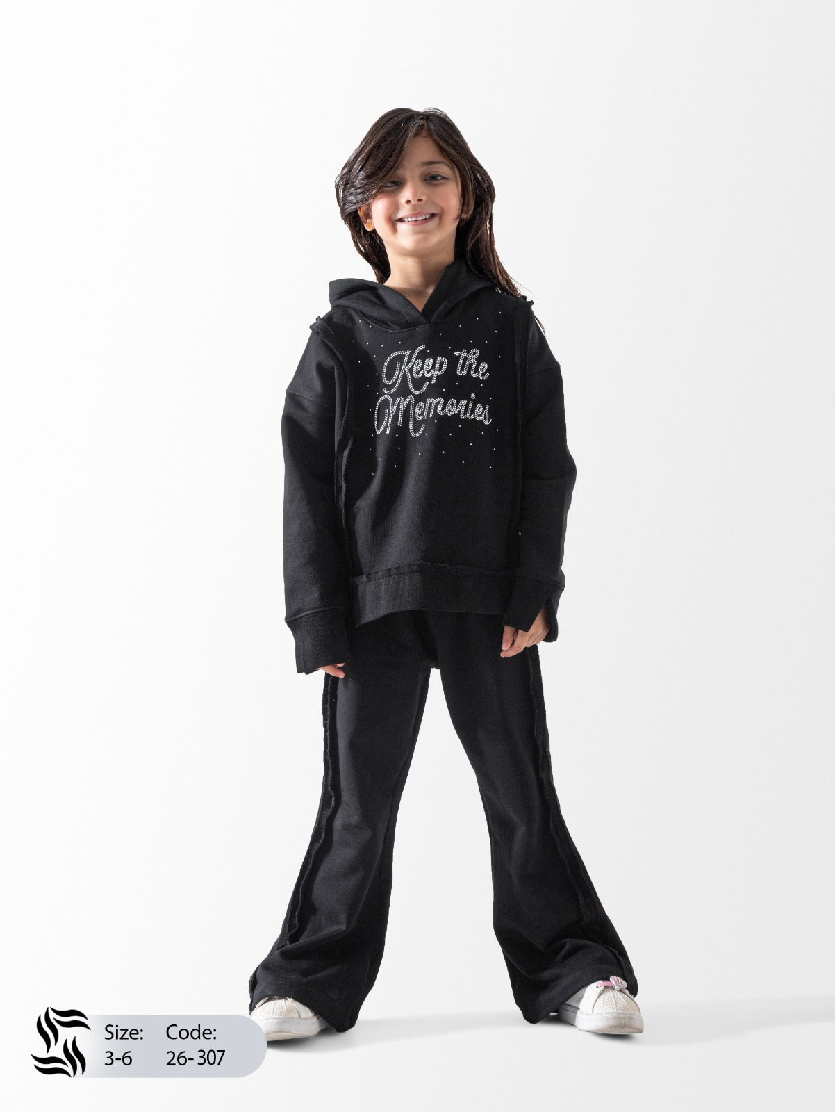 Give your little girl a stylish look that combines comfort and charm with this unique Bebic set. The set includes a warm hoodie featuring the phrase "Keep the Memories" embellished with sparkling beads on the chest, along with subtle stitching details on the sides for a sporty yet elegant touch. It also comes with flared pants, a trendy style that allows your child freedom of movement while maintaining a sophisticated look. Made from high-quality, soft materials, this set is perfect for everyday outings or casual occasions in cooler weather.
