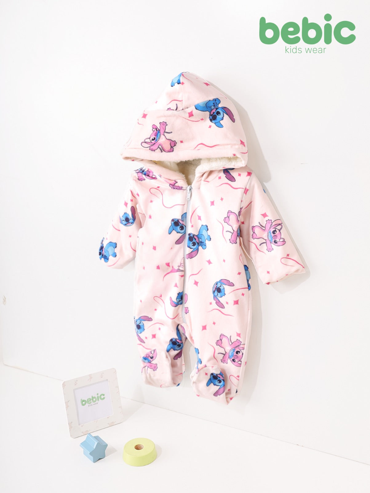 "A light pink fleece baby winter jumpsuit, decorated with cheerful Stitch & Angel prints and scattered tiny stars. The jumpsuit features a thick white sherpa lining for maximum warmth and has a long front zipper for easy dressing. The design includes a warm hood and fully enclosed feet to ensure the baby is protected from the cold on freezing days."