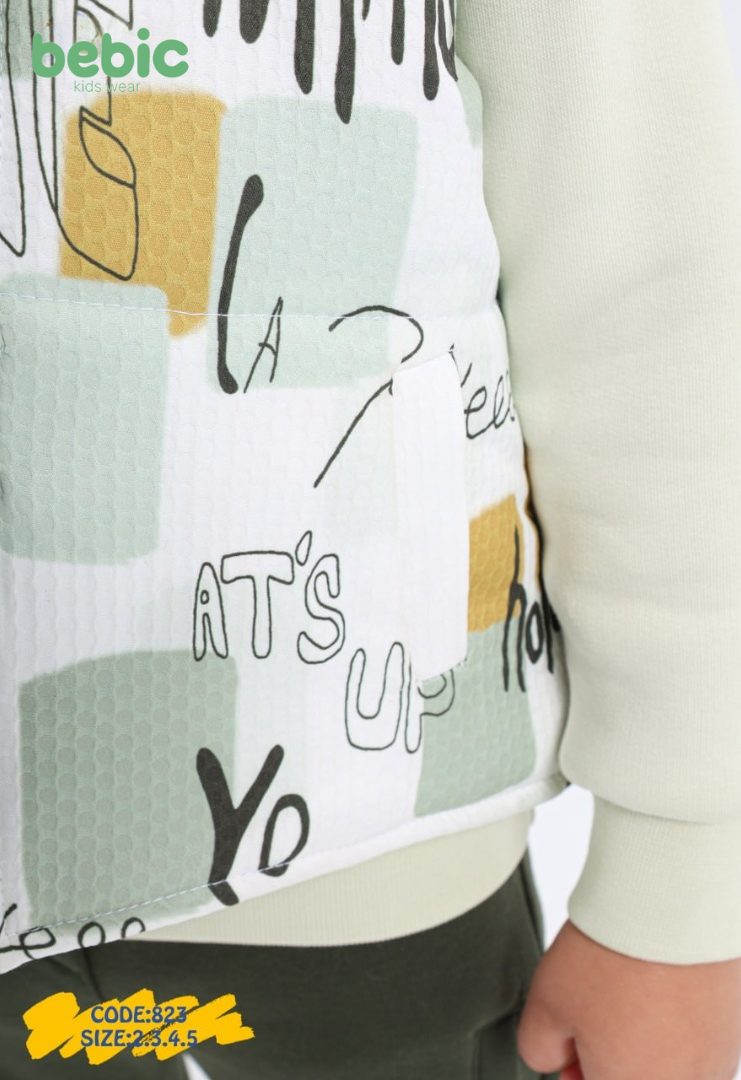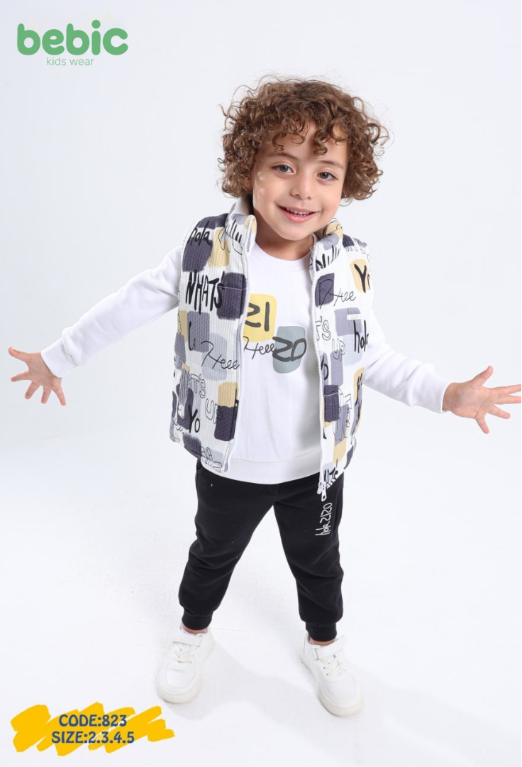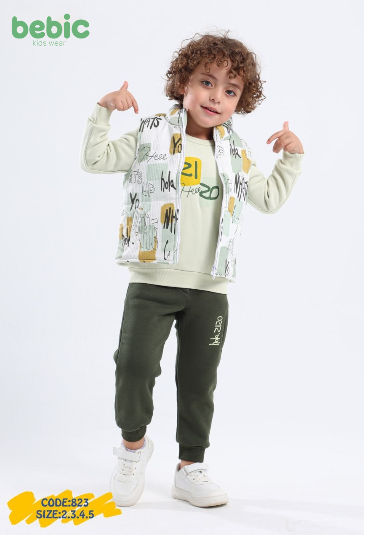 The outfit consists of three pieces: a long-sleeve sweatshirt with a simple design, comfortable jogger pants with a printed detail on the leg, and a sleeveless vest featuring trendy, bold text prints. This set is perfect for active kids, combining modern style with everyday comfort.