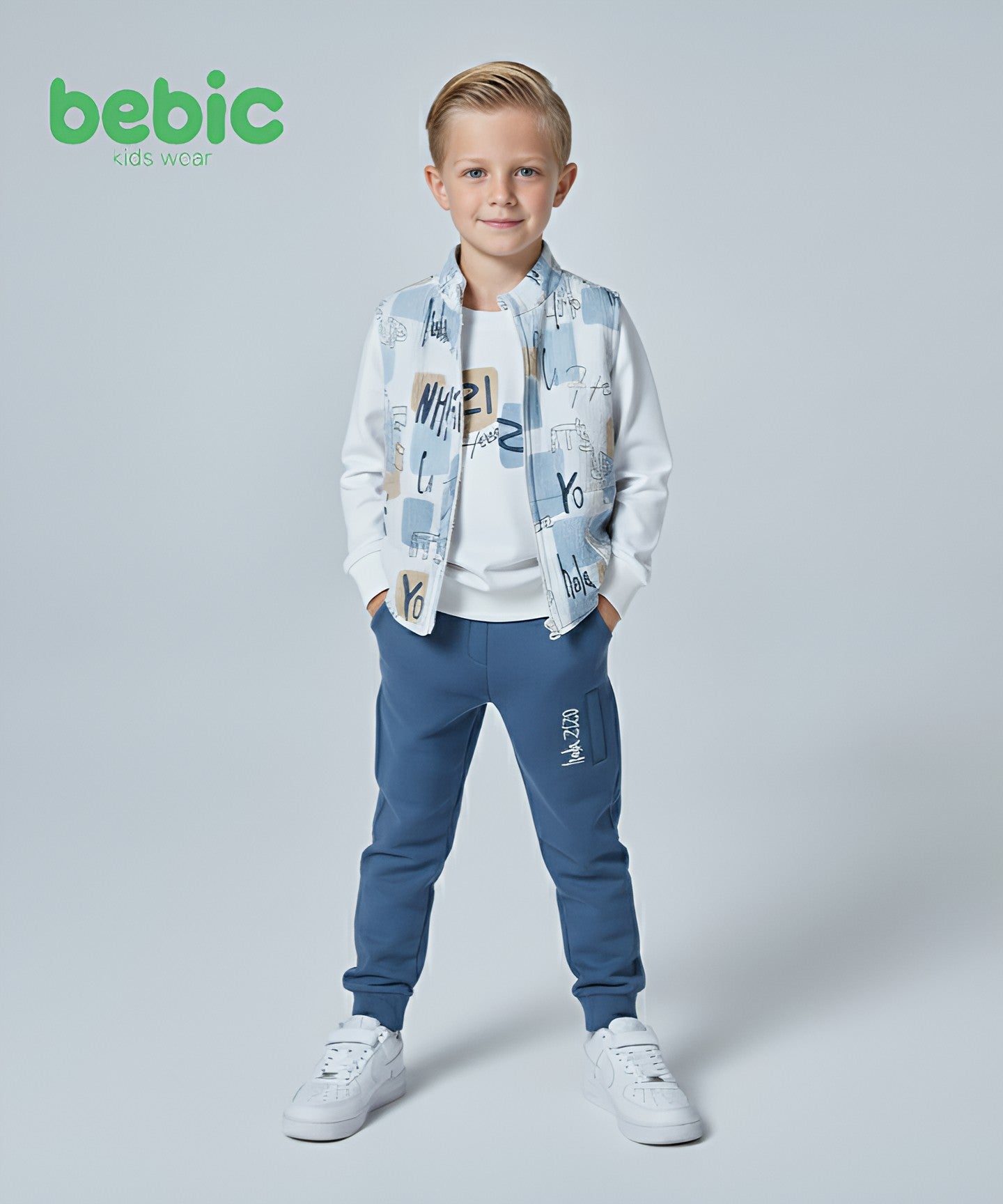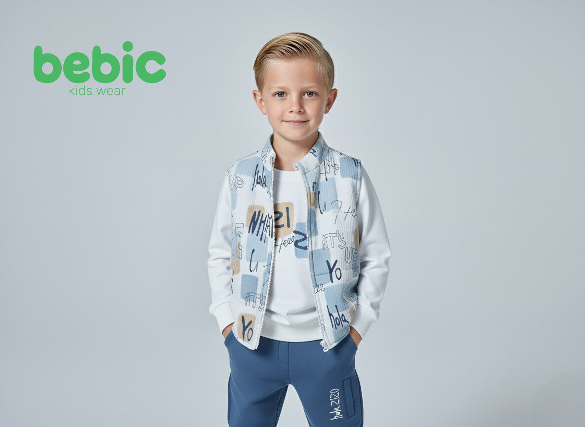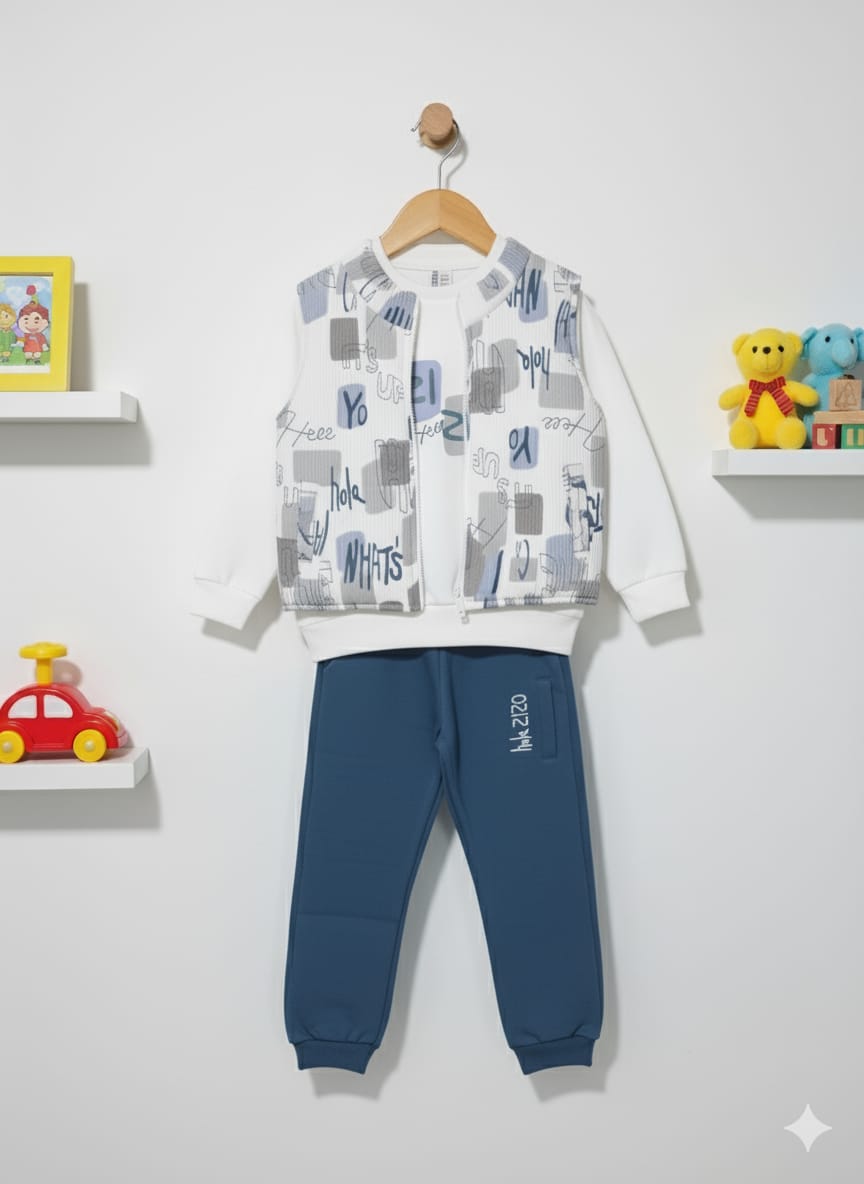 The outfit consists of three pieces: a long-sleeve sweatshirt with a simple design, comfortable jogger pants with a printed detail on the leg, and a sleeveless vest featuring trendy, bold text prints. This set is perfect for active kids, combining modern style with everyday comfort.
