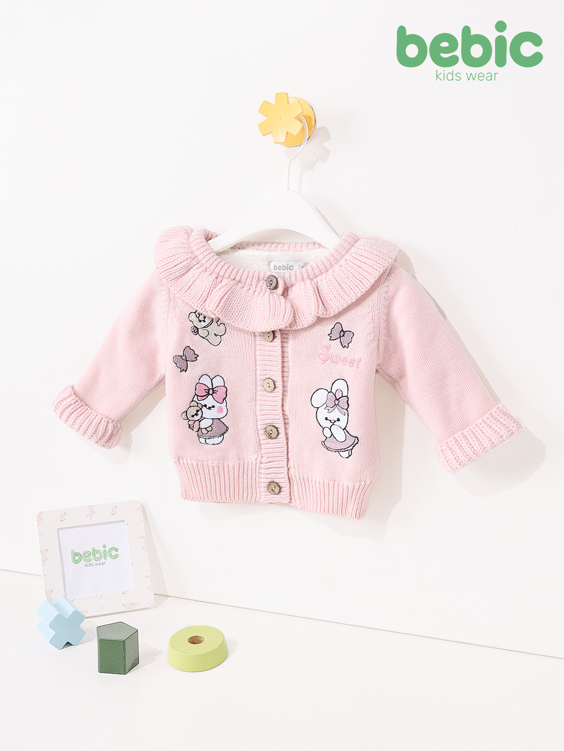 This baby pink knit winter cardigan is perfect for children. It features a wide, ruffled, ribbed collar and is adorned with cute embroidered cartoon girls or bunnies in dresses and bows. The cardigan fastens with round wooden buttons and has ribbed, pleated hem and cuffs. A hint of white/faux fur lining is visible at the collar, indicating that it is lined for extra warmth.