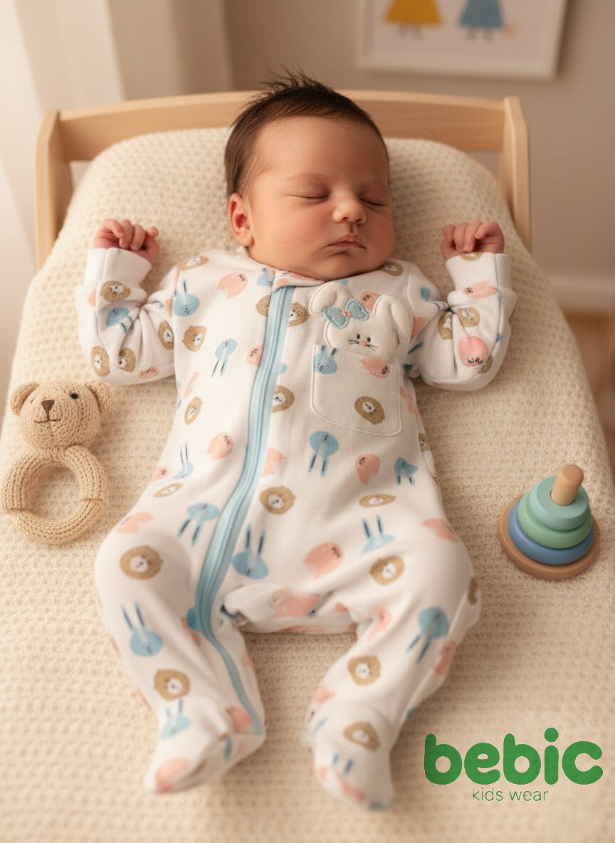 This piece shines with a crisp white romper design, reflecting the purity of childhood in soft pastel shades of sky blue and apricot pink. Adorned with charming circular prints of tiny animal faces, the set is perfectly placed, giving it a lively yet delicate look. A light blue zipper makes it easy to put on, and a delightful side pocket reveals a white bunny wearing a small blue bow – a charming artistic touch. The soft cotton fabric and footed design ensure your little one is warm and comfortable for sleeping or playing.