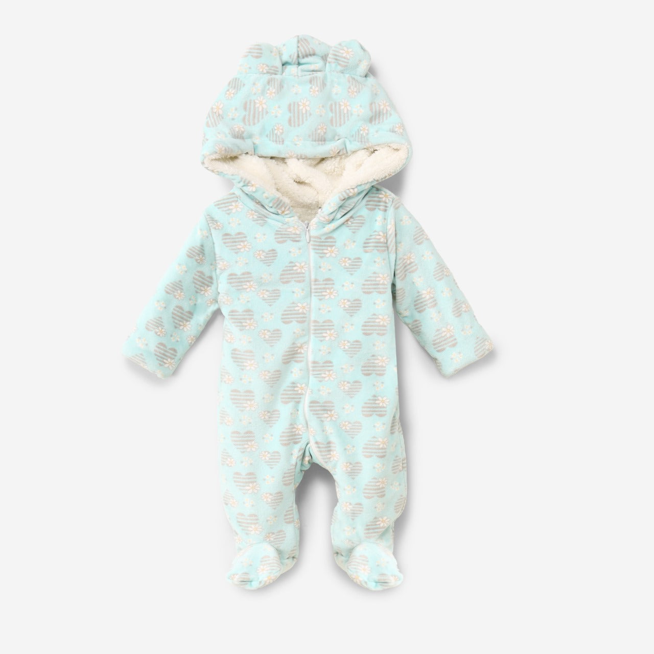 This baby winter romper is adorned with a soft pattern of hearts, stripes, and tiny flowers. It features a cute hood with tiny teddy bear ears and a white faux fur lining for warmth. The outer fabric is soft and plush. The romper has closed feet and a full front zipper for easy dressing and changing. It's a warm, fluffy, and unisex option.