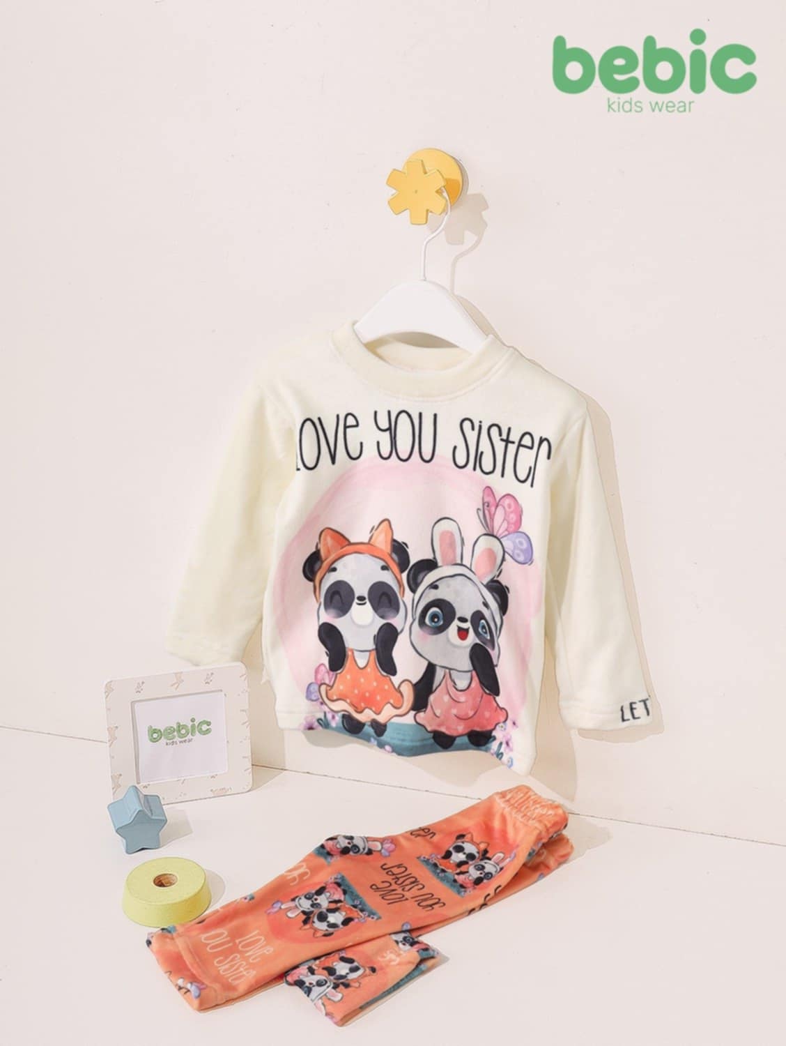 A soft and cute pajama set featuring a light-colored T-shirt and orange pants featuring cute graphics of two little bears in different outfits. The T-shirt features the phrase "LOVE YOU SISTER," adding a touch of love and warmth to little sisters. The comfortable and warm fabric is perfect for chilly nights, and the fun colors are perfect for girls and add a cheerful touch to the look.