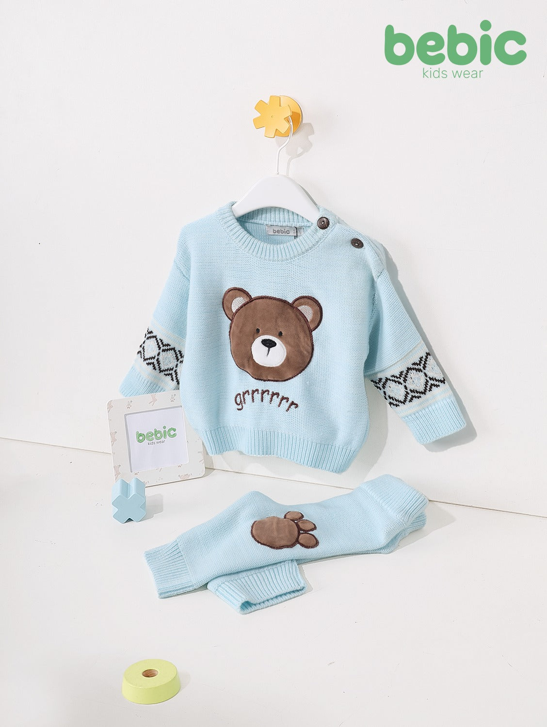 A two-piece winter set (sweater and pants) in a calming light blue. The sweater is made of warm knit fabric and features a large embroidered teddy bear in the center and the words "grrrrr," along with geometric patterns on the sleeves. It has buttons on the shoulder for easy dressing. The pants are made of the same color and knit fabric and feature a bear paw print on the knee. The set is comfortable and perfect for cold weather.