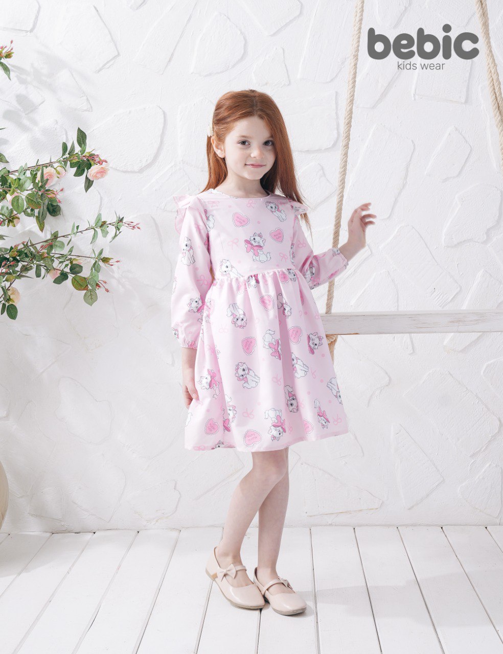 The dress pictured is a girls' pink dress with long sleeves and a flared design at the bottom. It features tiny white cat underwear with pink hearts and delicate bows, giving it a childlike and lovable feel.