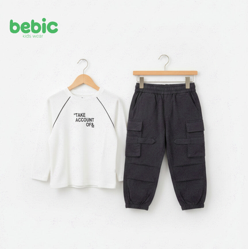 Give your child a practical yet stylish look with this distinctive Bebic set. It features a soft, long-sleeved jumper in a trendy raglan design with subtle shoulder lines and a stylish "TAKE ACCOUNT OF" print for a modern and understated touch. The set is completed with comfortable cargo pants featuring prominent side pockets and decorative belt details for a sporty, rugged look, along with elasticated cuffs for freedom of movement during play. Made from durable cotton, this set is built to last and provides all-day warmth and comfort.