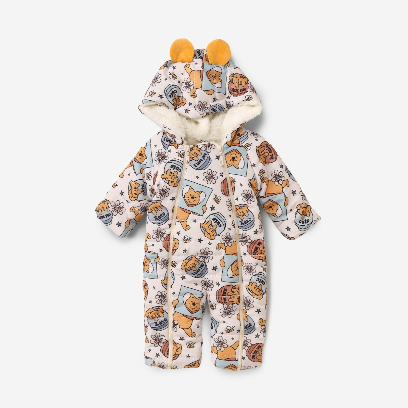 A cozy winter romper waterproof for babies featuring a Winnie the Pooh design. The repeating pattern showcases cute Winnie the Pooh, honey pots, and flowers on a soft white/beige background with muted colors like pale orange and sky blue. It has a hood adorned with adorable orange bear ears. The hood and legs are lined with soft white sherpa fleece for extra warmth. It has a front zipper closure.