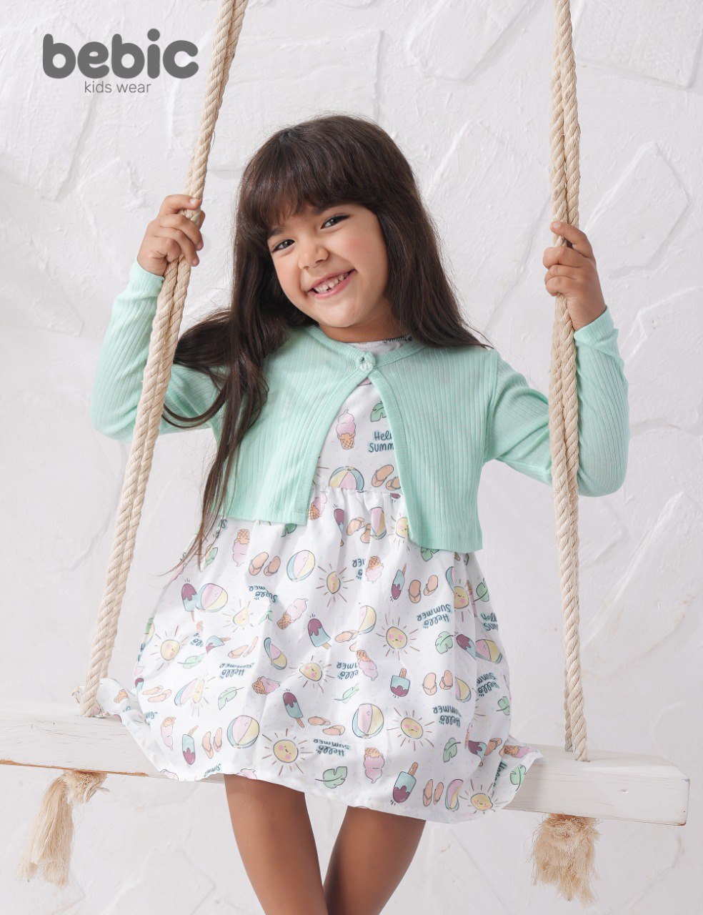 This elegant and practical dress is designed for cold winter weather. It features a white color embellished with cute colorful motifs such as the sun, ice cream, and small balls, adding a fun touch despite the wintery mood. Its loose, comfortable fit allows the little girl freedom of movement, while a soft, light green cardigan adds warmth and elegance to the look. The fabric is of medium thickness and is perfect for cold days, combining comfort and warmth. The dress is a great choice for winter outings or everyday occasions, giving the little girl a modern look that is both cheerful and warm.